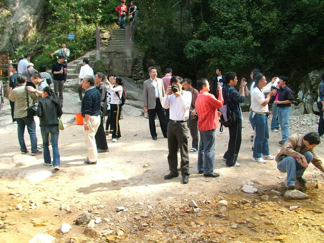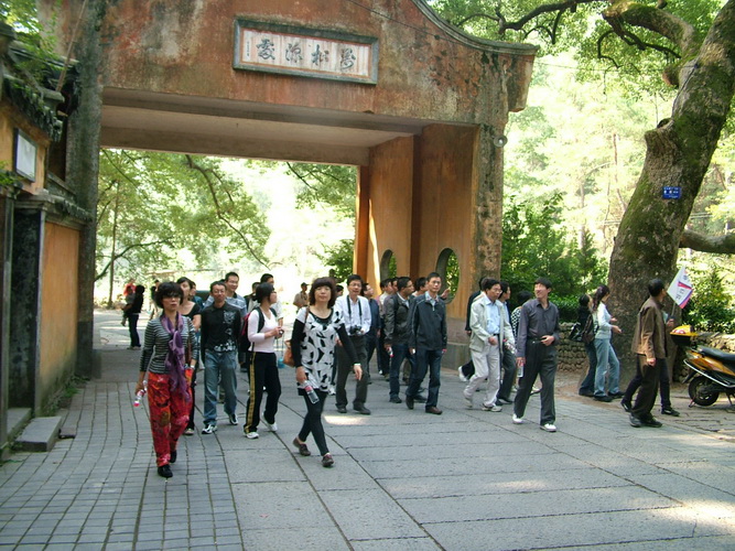 10月17日,老师们首先参观了国清寺。国清寺坐落在浙江省台州市天台县华顶山麓,是我国著名古刹之一,被中、日两国佛教奉为发祥地,距今己有一千四百多年历史。五峰耸峙、双涧萦流。大雄宝殿前的铜鼎炉,炉高4米多,为清代所铸;大雄宝殿内正中的莲花宝座上端坐着释迦佛铜像,莲座高6.8米,重13吨,为明代所铸。无论是铜鼎炉还是释迦佛铜像,工程之大,做工之精细,都超乎想象,引起金属材料所各位老师的关注,并引发一场深刻的讨论。“人间古刹越千年”,廊檐禅门之中,体现着古人的深邃与睿智,巍然挺拔的隋塔还有千年不老的古梅,让老师们不禁啧啧称奇。下午接着参观了石梁飞瀑。石梁飞瀑不比其他瀑布壮观,但有其独特之处。一条二丈左右的天然石梁桥,横跨两侧险峻悬崖之间,微微拱起的梁面,仿佛一条匍伏的巨蟒,左右而来的两条溪水激起浪花万朵,飞流直下,真有“沧海平翻龙背上,银河倒泻雀桥东”之势。著名的品牌啤酒“红石梁”就是以此命名的。在这青山秀水之间,老师们抛下了一切尘世烦恼,留下了一张张美丽而纯真的笑容。