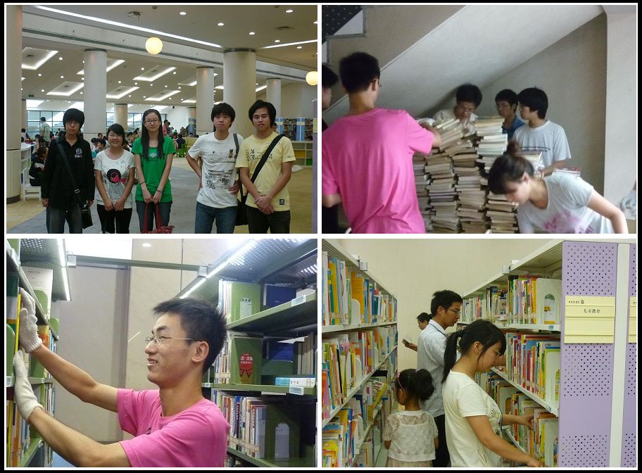 短暂的介绍之后,在工作人员的带领下,我们便开始了第一天的志愿者活动。男同学们负责图书的分类、上架工作,女同学们则在少幼区协助维持秩序和整理书籍。