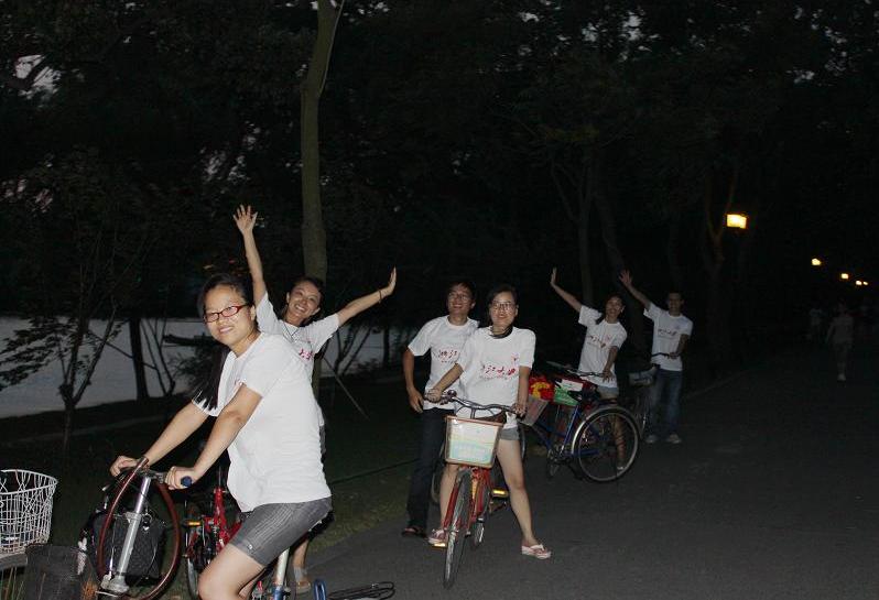 活动伊始,实践团成员们便在浙江大学门前集结,共同喊起了 “低碳、节能”的口号。随后,实践团成员全部骑脚踏车,从正门出发,沿苏堤杨公堤的路线出行,开始了宣传活动