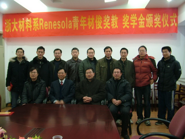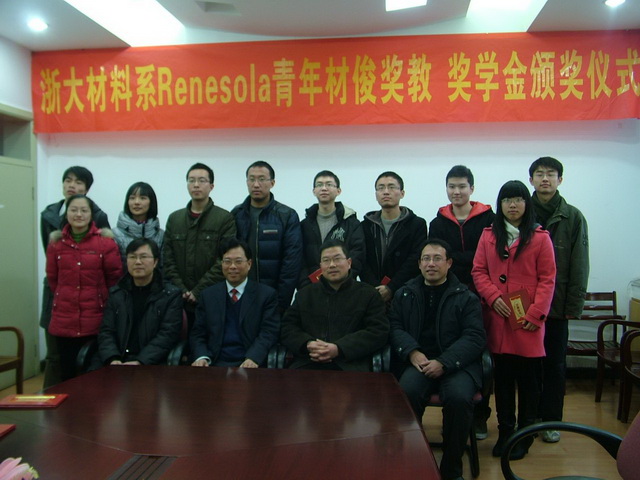 2011年1月19日,材料系在326会议室隆重举行了“2010年首届ReneSola青年材俊奖教、奖学金”的颁奖仪式。ReneSola青年材俊奖教旨在奖励在近年来在新材料研究领域取得创新性工作和标志性成果的年轻教师;奖学金旨在奖励在材料系学习、科研开发和社会实践等领域取得创新性成果的注册在校非在职优秀研究生和本科生。此次是首次颁奖,共有10位教师和10位同学获得了奖励。ReneSola集团(浙江昱辉太阳能有限公司)冒雪前来为获奖者颁奖。颁奖仪式由系主任叶志镇教授主持。