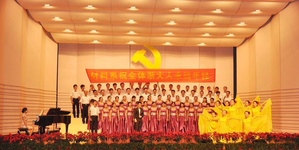 67晚,紫金港小剧场传出阵阵悠扬的歌声,由校党委举办的党在我心中·永远跟党走浙江大学庆祝中国共产党成立90周年歌咏比赛隆重举行。21:15材料系张泽院士和党政班子一起,带领由79人组成的材料系师生合唱团唱响了一曲《革命人永远是年轻》,充分展现了材料系师生以革命人的饱满热情,求是创新,奋发进取,在迈向世界一流的道路上永远年轻的精神风貌,为建党90周年献上隆重的贺礼。