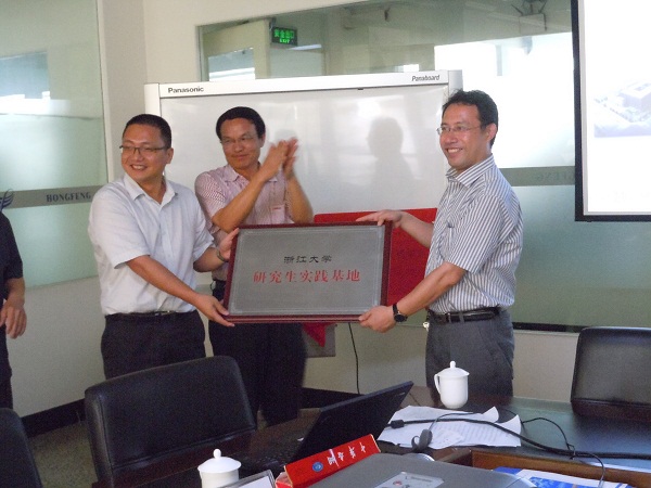 仪式的开始,主持人便向大家介绍了乐清这个崛起的城市。它风景优美,有国家自然遗产雁荡山;它的经济高速发展,在全国百强县中居15位;它更是一个注重科技、尊重知识的地方,渴望人才,引进技术,用自己的力量来推进企业转型,创造经济价值。而陈乐生副总向大家传达了他对于实践队同学和浙大的感谢,并且认为这次的交流活动能够为公司注入新的理念、提高同学们的实践能力、增强公司和浙大的联系枢纽。赵局长讲话中则深切表示出他对浙大师生一行人的热烈欢迎,同时,肯定了宏丰公司这几年的成长,介绍了乐清市的经济和发展,表达了对于科研的期盼。会议的气氛一直都非常轻松愉悦,每次领导们讲到了自己的故事,总是让大家忍俊不禁。之后,张亨根主任也做了简短的讲话,表示了对基地授牌的热烈祝贺,希望科学实践与社会实践相结合,在实践中向优秀的人才学习。