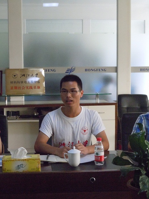 同时,浙江大学的王东老师和实践队队长也分别作了讲话。王东老师介绍了浙江大学材料系的概况、材料系与宏丰公司的良好合作传统,并充分肯定了这次实践的意义和优势条件,他指出,作为一名合格的大学生,必须要做到“受教育、长才干、做贡献”。而实践队队长周杰同学则也十分感谢市领导、宏丰公司和材料系的老师,给予同学们这样一个实践的机会,来实现自身和企业的双赢。