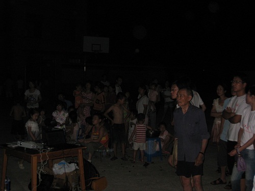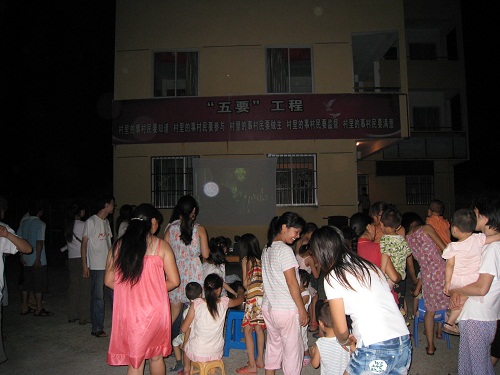 随后,开始正式播放电影,队员们在出发前经过团队的共同商议,决定选取《建党伟业》。这部电影非常好的反映了我党在封建腐朽与民主盛行的博弈较量中的建立过程,正值建党九十周年之际,在红色基点村洋墩村放映这样一部电影是具有深远意义的。另外,这部电影为近期新上映的,大多数村民还没有看过,因此放映这部电影也将达到一定的宣传效果。村民朋友们聚集在屏幕前认真的观看电影,现场气氛非常热闹。