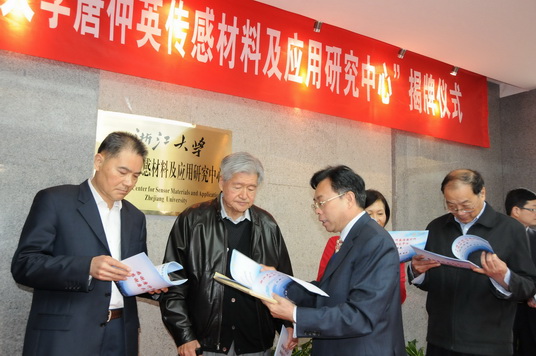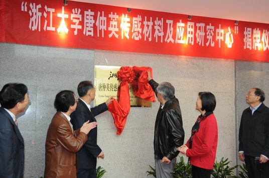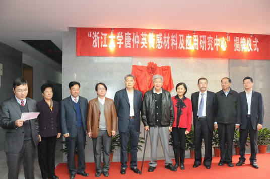11月14日上午,美国唐氏工业董事长、唐氏基金会董事长、浙江大学首位名誉校董唐仲英先生,美国唐氏企业公司副总经理、唐仲英基金会执行董事徐小春女士,唐仲英基金会中国办事处主任孙幼帆,浙大网新集团董事长赵建、总裁张四纲、董秘兼副总裁吴晓农、总裁助理蒋艰一行来我校参加浙江大学唐仲英传感材料及应用研究中心(简称“中心”)揭牌仪式。浙江大学党委书记金德水、副校长吴朝晖、校长助理、浙大教育基金会秘书长张美凤、材料系系主任叶志镇、副系主任翁文剑、涂江平以及师生代表近八十余人参加了揭牌仪式。
