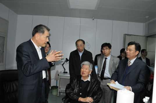 叶志镇教授向唐仲英先生汇报工作 金德水书记陪同唐仲英先生参观电镜中心