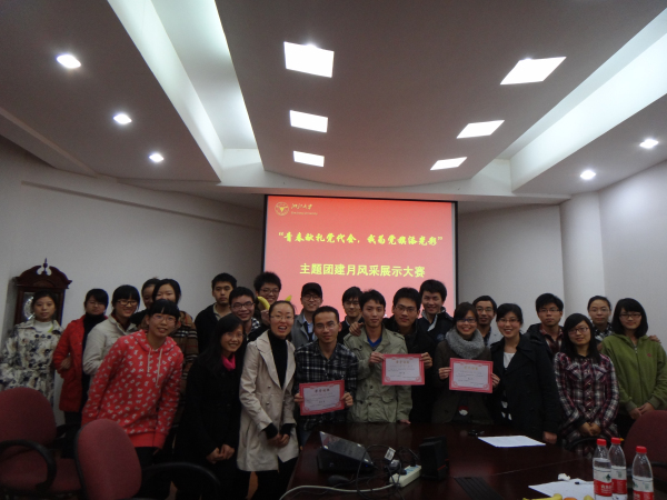 201111241830分,材料系2011年团建月风采展示在曹光彪大楼的材料系会议室正式开始。此次总结报告会将检验08级、09级各个团支部开学以来的团建成果,由材料系团委副书记徐晗老师和杨倩老师、本科生党总支委员李水丽和系挂职团委副书记黄静露同学担任评委现场评分,并做最后的评选表彰工作。