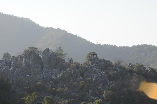千岛湖石林海拔650余米,是一个迷宫式喀斯特地貌的溶岩景观,由蓝玉坪、玳瑁岭、西山坪组成。区内群峰壁立,层峦叠嶂,石壁、石柱、石笋、石洞等体态纷呈,各具特色,有“华东第一石林”的美誉。暖暖的阳光肆意地照着每一个人,在这崇山峻岭间,石峰峭立,千姿百态,峰回路转,鬼斧神工,妙趣横生,他们时而拍照,时而呼朋唤友,因为石林就像“迷魂阵”,石隙间的小路曲折回环,一不小心往往走回原处,大家散落其间,往往只听声音不见人。
