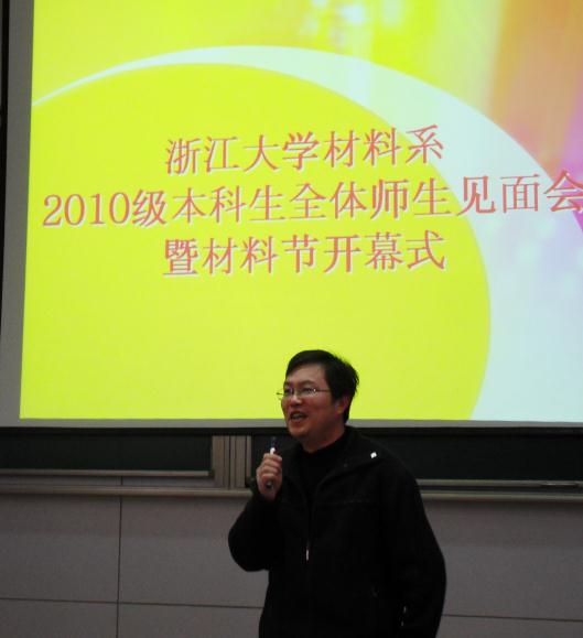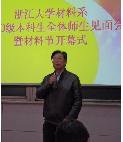 大会在1300准时开始,首先由系主任叶志镇老师致辞,叶老师对10级同学的到来表达了热诚的欢迎,并简要的为大家介绍了材料系师资和教学的基本情况,他以我系诸多年轻有为的青年教师为例鼓励大家在材料系努力学习,用心科研,再创佳绩,实现新的突破。随后,王东老师、韩高荣老师以及到场的所有老师都纷纷跟大家做了交流。各位老师幽默而真诚的演说使同学们都十分激动,现场气氛热烈,高潮迭起。