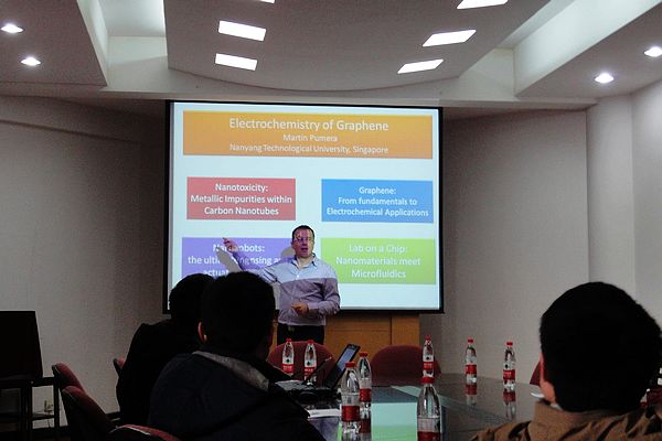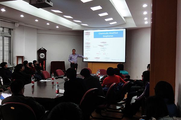 Martin Pumera教授首先做了题为Electrochemistry of graphene and carbon nanotubes. Towards self propelled systems的报告。Martin Pumera教授2001年在捷克查理大学获得博士学位, 2006年加入日本国家材料科学研究所(NIMS),2010年加入了新加波南洋理工大学。Martin Pumera教授对微系统和纳米技术领域的电化学和电泳特性非常感兴趣。在本次讲座中,Martin Pumera教授图文并茂的为我们详细叙述了石墨烯和碳纳米管中的电化学特性。