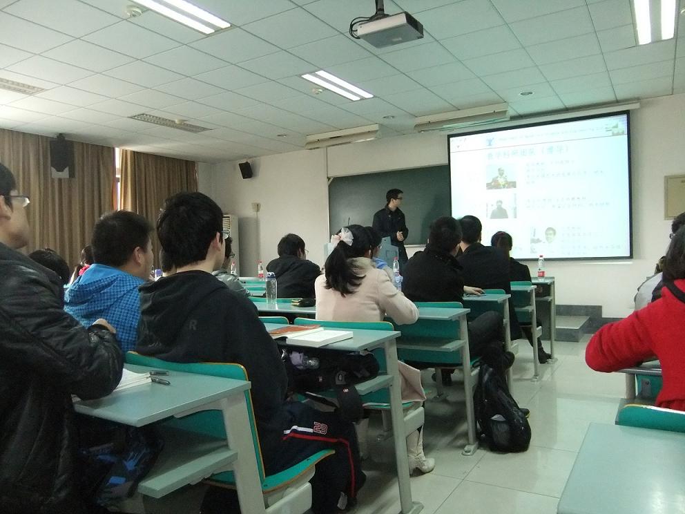 2012318下午3点,宣讲会正式开始。本次宣讲会由杨倩老师主持,来自各研究所的青年骨干教授随后一一登台,以幽默轻松的语调介绍各自研究所正在进行的科研项目,并热情欢迎同学们加入。系党委书记王东老师也对我系同学的发展规划提供了宝贵的建议。
