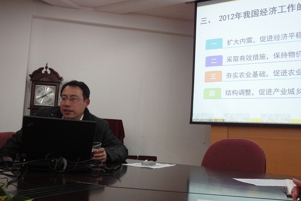 接下来时间里,王老师深入浅出地分析了当前世界经济格局,并对美国、欧盟、日本、新兴经济市场等主要地区的经济情况做了详细的介绍,提出了许多独到的见解与观点。在分析了世界经济格局的基础上,王老师结合最近召开的“两会”,为同学们解析了中国经济的现状与面临的新挑战。同学们被王老师生动、幽默的演说吸引,都听的格外出神,会议室内不时地传出阵阵笑声和掌声。