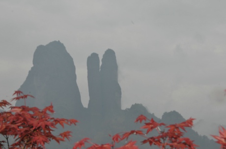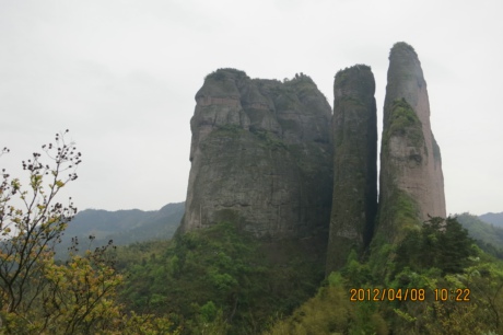 有老师从山下就餐的饭店拍摄“三爿石”,朦胧中似呈江郎在旁目睹一对相拥的恋人, “问江郎情为何物?”,羡慕?嫉妒?恨?~~~~~~。你说兄弟三石伫立,他道羡慕恋人相拥,奇妙构图浮想联翩,只因观赏角度不同。
