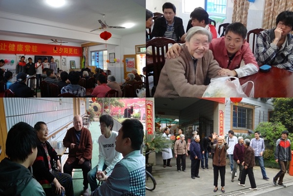 古荡老人公寓位于浙江大学科技园内,这里环境清幽,干净整洁,有六十多位老人,年纪最大的有九十多岁,平均年龄75岁左右。爷爷奶奶们都很热情,纷纷要求大家表演节目。各小组就轮番上台为老人们表演才艺,一展歌喉。一位年轻时做过音乐教师的老奶奶还为我们演唱了一曲《甜蜜蜜》,韵味十足,听得我们如痴如醉。节目表演完后,同学们和老人们聊起了天,唠起了家常。这里的老人们虽然年迈,但思路仍很清晰,大多是本地人,虽然有些带有江浙口音,有些耳朵已经不灵了,但我们之间交流无碍,一时间屋子里充满了笑声。通过交流我们发现这里的老人都不简单,有的年轻时是运动健将,骑行达人;有的知识渊博,出过很多书;还有老人紧跟时代潮流,有自己的微博,每天更新,粉丝还不少呢。