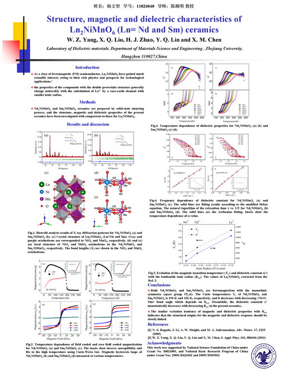 一个优秀的学术墙报需要做到样式简洁优美,内容充实丰富,同时讲解人思路清晰,讲解过程重点突出,深入浅出。杨文智的学术墙报包括标题、简介、方法、结果讨论、结论、致谢等,符合国际惯例。同时,在形式上以白底为背景,简洁明快,字体选择和大小适中,图表细节优秀。在内容方面,该墙报系统地介绍了双钙钛矿Ln2NiMnO6陶瓷中Ln离子半径对磁性和介电性能的影响,发现Ln2NiMnO6陶瓷的铁磁居里点和介电常数随着Ln离子半径的减小逐渐下降。以该墙报为基础,杨文智同学将相关研究结果发表在应用物理领域里的老牌期刊Journal of Applied Physics上,体现了该墙报的学术水平。在墙报讲解过程中,杨文智同学在简明扼要而又不失深度的阐述工作的同时,对评审专家和同学的提问能够做到抓住重点,回答关键问题,体现出作者具有较扎实的专业基础知识,较强的逻辑思维能力和表达能力。综上所述,推荐杨文智同学的墙报为博士组的优秀墙报。