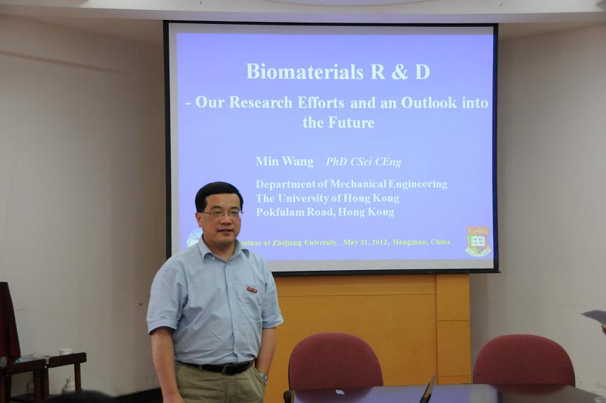 简单的授聘仪式后,王敏教授为与会师生带来了题为:“Biomaterials R & D: Our Research Efforts and an Outlook into the Future”全英文学术报告。王敏教授在报告中详细介绍了生物材料和组织工程的研究和开发。他所研究的生物材料范围广泛,涉及陶瓷、聚合物、金属以及复合材料多个领域。其中,在生物活性复合材料,生物材料表面改性、组织工程支架、纳米生物材料方面,王敏教授进行了大量的研究工作,并取得了国际领先的研究成果。