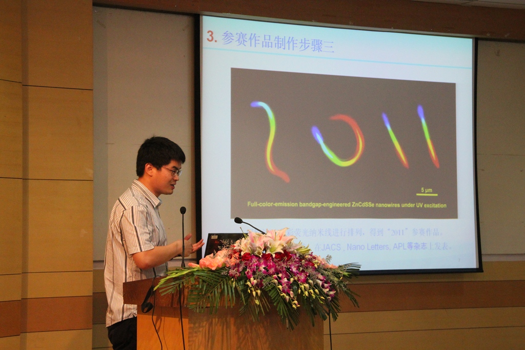 在浙江大学材料系系主任叶志镇教授简短的致辞之后,决赛答辩正式开始。27位参赛作者依次向大家呈现了一幅幅奇妙无穷、富于想象的微结构作品,将现场观众带入一个个美妙的材料微观世界。俞迎霞的“据霜木芙蓉”栩栩如生,将层片状的Co3O4赋予生命,变成了朵朵盛开的芙蓉;高分子系大三学生厉王秋的“热带雨林灌木丛”,将CdS可见光处理后的形貌图披上绿纱后,勃勃生机跃然图中,俨然正是那富有生命力的热带雨林;光电系杨宗银的作品“彩虹”则是把VLS法合成的荧光纳米线排列成2011的形状,在紫外光照射下,每个数字显现出七彩的颜色,宛如雨后的彩虹。该作品不但构图精细,其背后蕴藏的科学性成果也很丰硕,作品的源文章曾发表于美国化学会志、纳米快报以及应用物理快报;路宜“薪火相传,光耀中华”通过湿化学和固相化学法提取单相Ni5P4,勾勒出奥运火炬,寓意光耀中华的火种在现代化建设的跑道上代代相传……