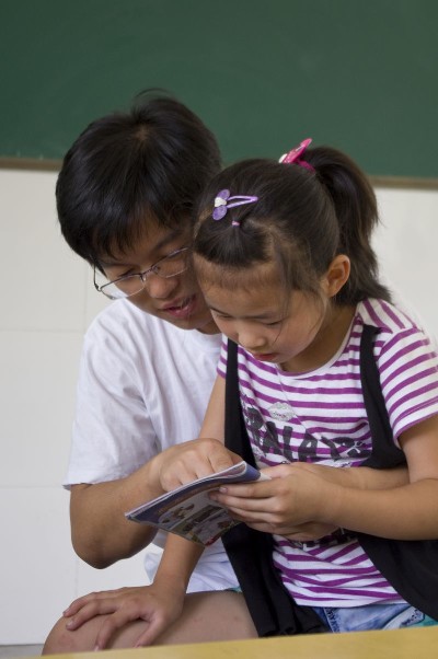 经过一番努力,教室收拾完毕,队员们开始和小朋友们做游戏,教孩子们读课文、学成语。教导孩子们的过程是非常累人的,但是看到孩子们吖吖读着课文,每个队员的心理都幸福满满的。
