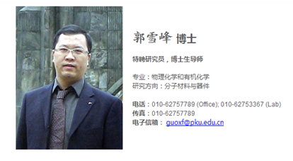 郭雪峰:北京师范大学学士和硕士(1994, 9-2001, 7: 北京师范大学化学系学士和硕士),中科院化学所博士(2004. 07),哥伦比亚大学纳米中心博士后,北京大学化学学院研究员(2008年1月起),先后获得全国百篇优秀博士论文奖,日本化学年会“The Distinguished Lectureship Award”,北京市科技新星奖,霍英东教育基金奖,中国化学学会青年化学奖。