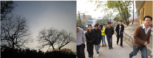 终于到达古荡山脚,开始登山,夕阳开始西坠,但同学们的热情不减。一路的自然风景显示着冬季的萧条,却也别有一番美感。一同学不禁触景生情,吟诵出“古道西风瘦马,夕阳西下,断肠人在天涯。”的元曲。