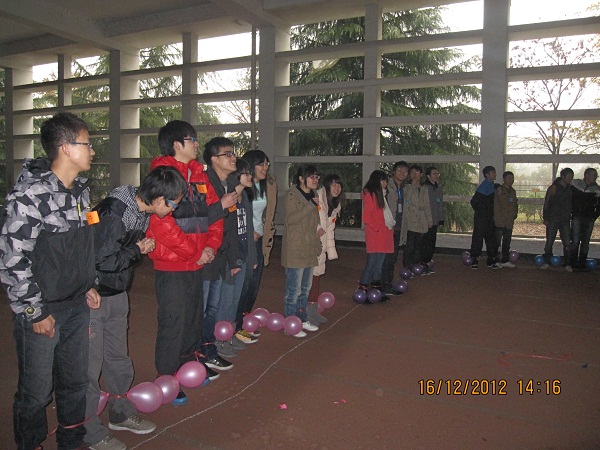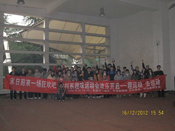 20121216,星期日下午,材料系趣味运动会在风雨操场欢乐开启。天空中虽然飘着小雨,但丝毫没有影响各位同学的参加热情。本次趣味运动会,由材料系学生会紫金港分会主办,主要面向材料系的各位大二新人,本科生辅导员张序清和数十位同学一起参加了本次活动。