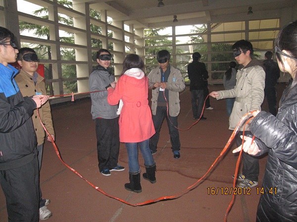 首先开始的问答题,以一些与材料系相关同时又风趣幽默的问题,调动了现场的气氛。紧接着,是踩气球游戏,两人为一组,两脚捆在一起绑上气球。同学们在场上或肩并肩,或手拉手,蹦跳往来,不亦乐乎。盲人方阵,是本次趣味运动会的创新之一,它要求七名参与者蒙上眼睛,在规定时间内用长短不一的四条绳子围成一个正方形,考验这大家的协调与合作能力。之后的投纸球游戏,要求各投掷者分别将纸球投入3.6m4.8m6.0m外的同学头上所顶的篓筐中,多组同学默契的配合赢得了大家的阵阵喝彩。最后的滚雪球游戏,则将本次趣味运动会的气氛推向了高潮,同学们手拉手,你追我敢,向着最后的胜利奋勇冲刺。