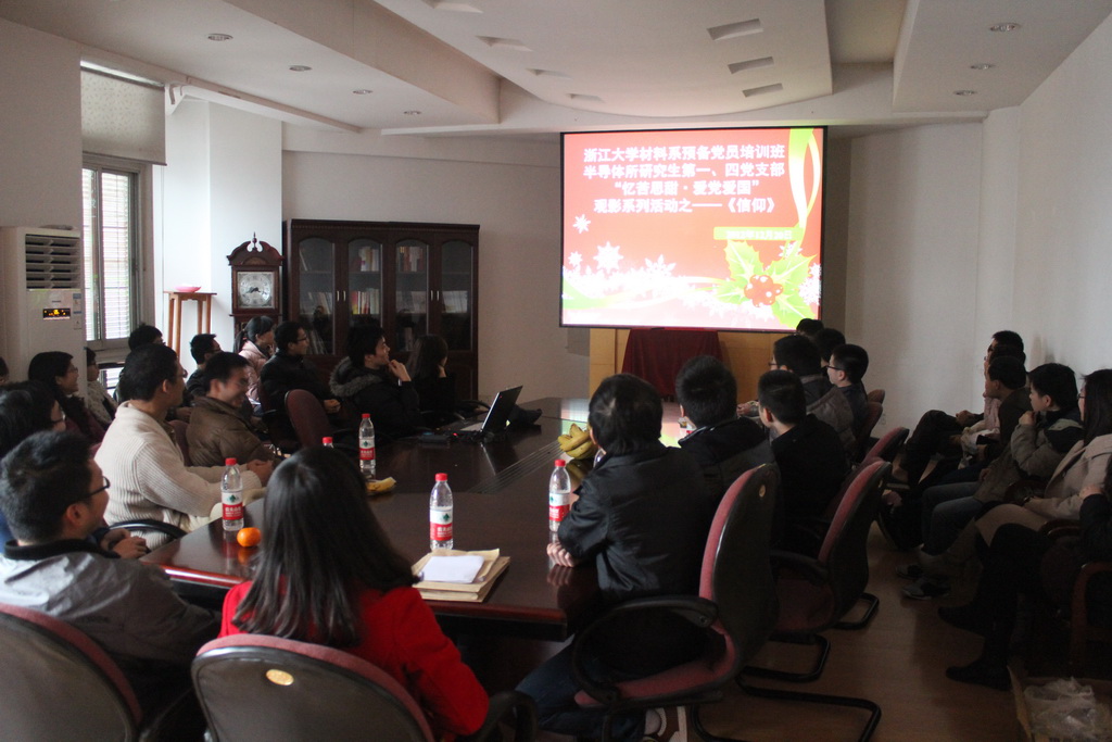 20121218日至20日,材料系半导体所研究生第一、四党支部联合举办了“忆苦思甜·爱党爱国”系列观影座谈活动,旨在通过此次活动,认真学习宣传贯彻党的十八大精神,扎实推进创先争优活动,引领党员干部学习先进、崇尚先进、争当先进、做时代先锋、为党旗添彩。