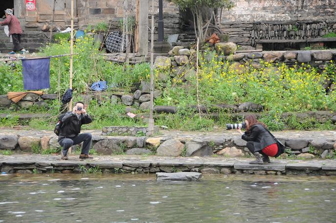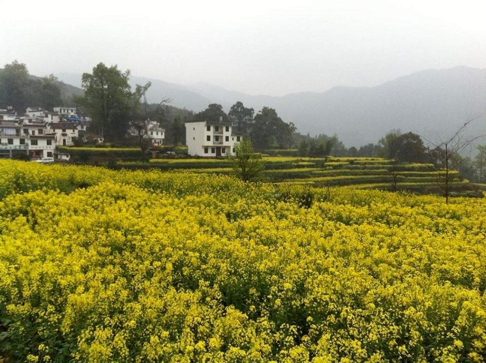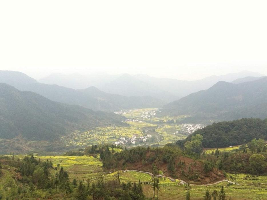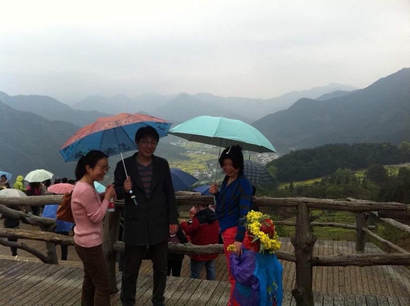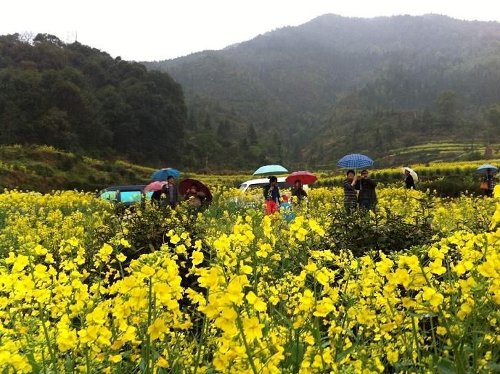 简单的中餐后,我们选择了具有“天上人间”之称的江岭欣赏梯田油菜风光。虽然天公不作美,下起了淅沥小雨,大家的心情丝毫没有受到影响,雨中赏花,别有一番意境。小车盘旋在山间小路,向下看去,漫山遍野油菜花黄,与白墙灰瓦的徽派建筑相互映衬,四周围绕着葱葱青山,一副美丽的婺源农村风光画卷展现在我们的面前。下车后,大家开心得向油菜花海奔去,纷纷拿起手中的相机,恨不得把所有美景都搬回家。