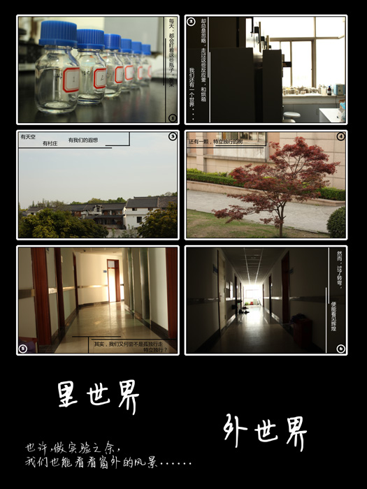 思索如何做出这组图片的时候,我就将实验室里面的仪器尽量的避免了,整个主题围绕着两个世界而来:因为很经常的认为,进入工科男的行列,走进实验室,似乎就只有数据和枯燥繁琐的实验,而内心的世界则是我们工科男潜在,不可忽视的另一个世界。这组图片没有人出现,很少实验器材出现,有内景,有外景,通过光影对照,构图设计,反映出工科男在实验室里的内心活动。