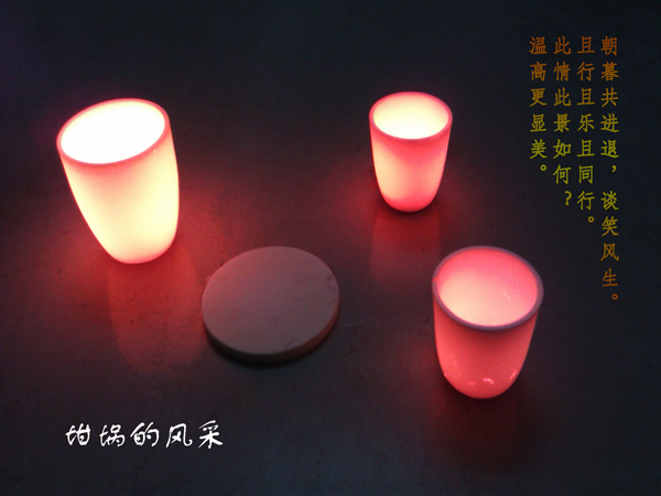 照片主体为1300中取出的坩埚与常温下坩埚盖的对比,在高温下坩埚反而别有一般风味。同时以此喻指实验室其乐融融的生活。