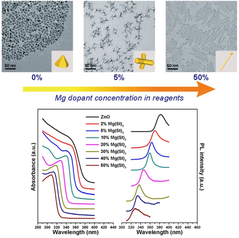 Mg组分调控ZnMgO纳米晶的形貌、结构与带宽 ZnO/ZnMgO LED原型器件发较强光 ZnO透明电极替代LED的ITO,节省95%铟