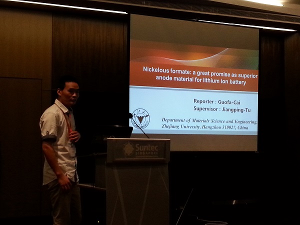 队员蔡国发、熊琴琴和赵旭阳分别在锂电分会场-负极材料介绍了各自的学术成果。队员蔡国发制备一种新型材料甲酸镍,并讨论其应用于锂电材料的可能性。通过适当的制备方法制备的甲酸镍材料,具有较好的电化学性能,会场内的其他研究者们都表现出了较大的兴趣,参与讨论,并提出了一些问题及很好的建议。蔡同学很好地回答了这些问题,并接受建议,为后续的研究开拓思路。队员熊琴琴介绍了纳米结构的铁钴氧复合材料,通过添加特定的物质,制备出了具有特殊结构,特定形貌的材料,应用于锂离子电池负极材料能大大提升电池性能。清晰的实验思路,流利的外语表达,赢得了会场所有人员的掌声。队员赵旭阳介绍了一种现在研究较为热点的电池体系-锂硫电池。着眼于现今锂离子电池受限于正极材料容量瓶颈,开发新型储能体系十分重要,赵同学介绍的硫正极材料是一种极具开发前景的材料,受到越来越多研究者的关注。队员们在参加这次会议之前都精心制备了PPT,并努力练习英语口语,为在会场成果展示做足了准备,也在会场展示中得到了与会研究同行们的肯定。