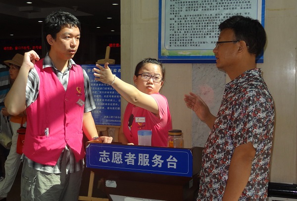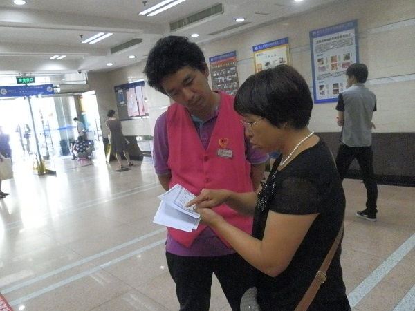 说起在医院的志愿者工作,并不像医生护士那样有难度,但也绝不是轻轻松松就能做好的。志愿者要负责咨询服务、就医引导、打印报告等诸多琐碎事项。在我们首次工作之前我们以为这些工作都很简单,但是真正开始服务时,才发现现实情况通常比理想条件复杂得多。很多病人初次来浙二医院,对于现代化的挂号和打印化验单程序并不熟悉,或是找不到需要的科室、楼层,或是不清楚看病流程,就需要我们十分耐心的指导,有些时候因为方言等原因同样的话需要重复好多次病人才听清楚。通常几个小时下来我们需要喝下几瓶水却还是口干舌燥。