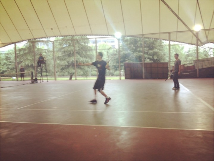 此次三好杯网球赛分为团体赛和个人赛,首先进行的是团体赛。我们首轮就和实力强劲的电气学院以及能源学院分到了一组。能源学院是我们小组赛遭遇的第一个对手,经过整整五盘大战以后,我们分别由徐迪恺同学拿下首场男单一的胜利(比分6:1),李敏同学赢下女单(7:6)以及两人的混双(6:2)击败对方,在男单二和男双失利的情况下以3:2的比分顺利晋级。这里值得一提的是打了一个多小时的女单比赛,李敏同学在0:3落后的情况下奋力拼搏,在第12局破掉对方发球局之后比赛打成6:6。随后的抢七争夺战,李敏在1:5落后的情况下连下6分将对手击败,极大地鼓舞了士气!(下图为男单一和女单比赛照片)