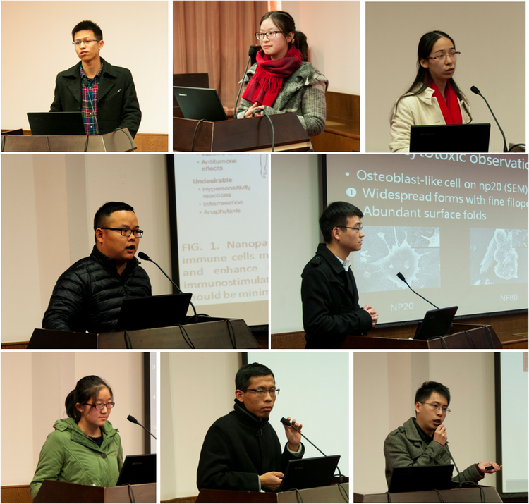 接下来由徐银川、洪逸、有传刚、庄均�、毕方刚、林文鑫、丁文婷、刘茂林、李晓静、蔡建宾和刘安同学分别介绍了自己的研究课题,在场老师和同学认真聆听同学汇报,并对其中的材料与医学交叉问题进行了热烈讨论。