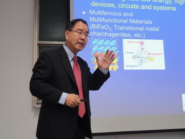 本次报告中,王康龙教授以“Energy Scaling of Spintronics – A new paradigm”为题,以其课题组研究的自旋转移矩STT与MeRAM计算机存储技术为例,介绍分析了低损耗智能系统的发展。报告首先简要回顾了当今CMOS领域所面临的重大挑战,提出了计算机系统发展对低能量、高速度、高稳定性的电子存储器件的需求,比较了STT技术与其他存储技术的性能差异。利用自旋霍尔效应产生的巨大移矩可以极大降低磁转换能。王教授课题组利用电压取代STT电流将数据写入存储,利用电势差进行磁位的转换,将数据写入存储器,这消除了通过导线移动大量电子的必要,减少了热量的产生,极大提高了能量转换效率与存储密度。
