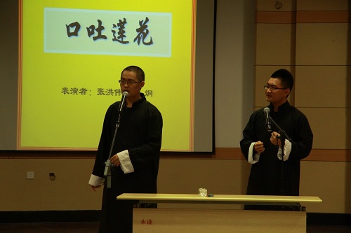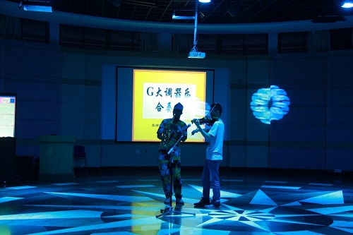 随后,隋强同学带来了一首《外面的世界》,低沉的声音唱出了他和大家心中对外面世界的感受——精彩与无奈。曹广同学携手外国朋友为大家带来了《G大调器乐合奏曲》,展现出了二人对乐器的掌控和熟练默契的配合。楼子瑞等一班同学带来的《指弹串烧》,结合了熟练的吉他演奏与歌曲合唱,悦动的节奏将现场带入了新一波的高潮。房迪老师和余倩老师分别为大家带来了他们精心准备的歌曲。