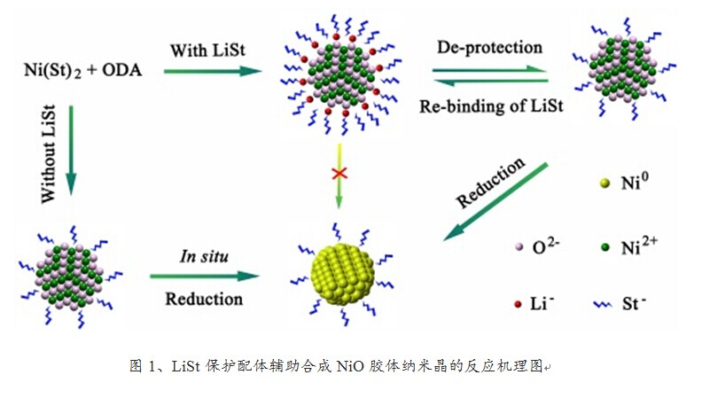 针对胶体纳米晶路线,硕士生奕清和梁骁勇等人在机理研究过程中发现NiO胶体纳米晶反应活性较高,易被原位还原为Ni金属。因此,通过在体系中引入惰性的LiSt作为“保护配体”吸附在NiO纳米晶的表面,从而降低了NiO纳米晶的活性(见图1)。所得到的纯相NiO胶体纳米晶可在130°C条件下加工成膜,并应用于溶液工艺的柔性高分子发光二极管(PLED)和有机光伏器件(OPV)中,表现出优越的空穴传输特性。同时,研究证明“保护配体”不仅适用于NiO纳米晶的合成,也为控制无机胶体纳米晶的反应活性,制备常规体系中不稳定的胶体纳米晶提供了一条新思路。该工作发表于Nano Letters(2014, 14, (6), 3117-3123, DOI: 10.1021/nl501763z)。