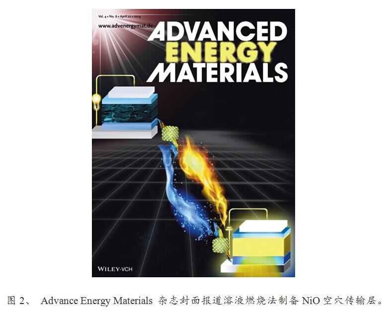针对前驱体反应路线,博士生白赛基于溶液燃烧法“自我供给能量”的反应特性,在前驱体溶液中分别引入硝酸镍作为氧化剂、乙酰丙酮或者甘氨酸作为燃料,通过优化反应体系中燃料的种类以及燃料与氧化剂的比例控制体系的氧化还原特性,成功地在较低温度下(175°C)制备出了均匀致密的纯相NiO薄膜。在此基础上,与苏州大学孙宝全课题组、瑞典Linköping大学Fengling Zhang和Feng Gao等开展合作研究,将溶液燃烧法制备的NiO薄膜用于OPV及PLED器件中,器件性能优异。该成果发表于Advanced Energy Materials (2014, 4, (6), DOI: 10.1002/aenm.201301460),并被该杂志以背封面的形式highlight报道(见图2)。