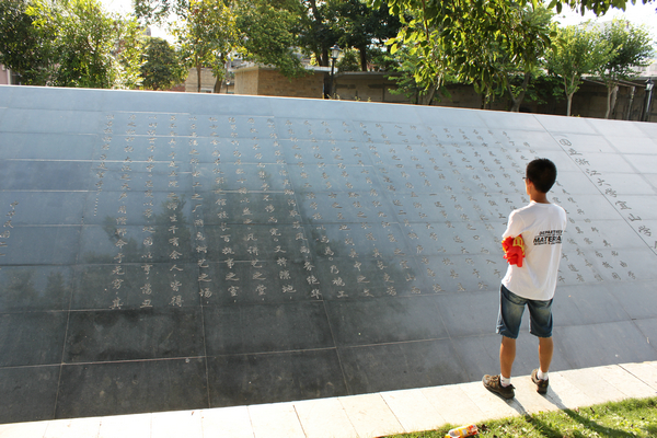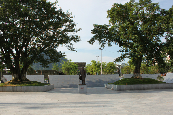 浙江大学西迁广场位于宜州城东文庙公园,宜州一中近旁,建成于2007年。下午4时半左右,同学们怀着激动而热烈的心情来到了西迁广场,大家都是第一次来,对这次参观都充满了无比的期待。广场正中是竺可桢老校长的塑像,于2013年树立。塑像中的竺校长依旧是西迁时那身熟悉的打扮,身着风衣,戴着眼镜,右手握着手杖,左手持着帽子,风度翩翩,一副学者之气,永远担当着浙大学子们的领路人。在与竺校长合影时,大家个个严肃认真。在竺校长塑像的左右各栽着一棵大树,如同两尊守卫一般。环绕着塑像与大树有三面倾斜的石壁,石壁上从右到左依次雕刻着浙大的校歌歌词,浙大的校训,竺校长所写的《国立浙江大学宜山学舍记》以及浙大西迁路线图。同学们有的站在校歌歌词之前情不自禁地唱了起来,有的用手指在图上“重走”了西迁路,有的仔细阅读了《国立浙江大学宜山学舍记》,了解了浙江大学西迁至广西宜山的背景、经过以及在宜山办学的困难与艰辛。大家沉浸在西迁文化浓厚的氛围之中。