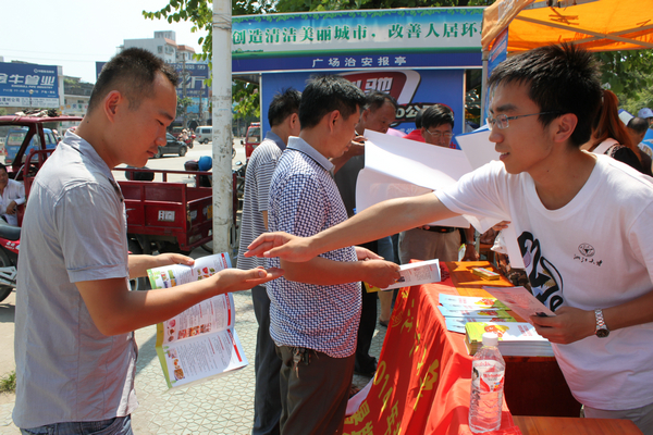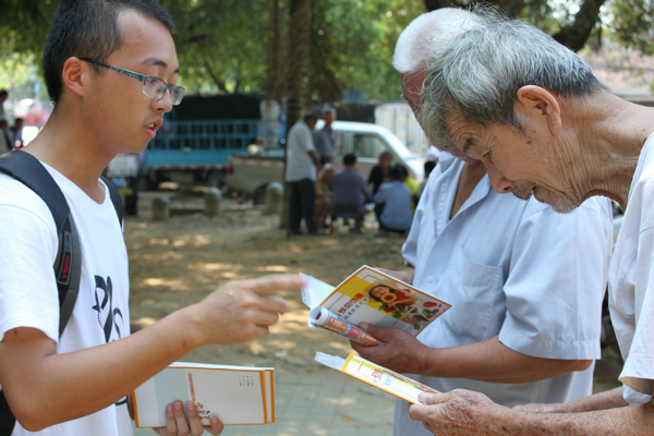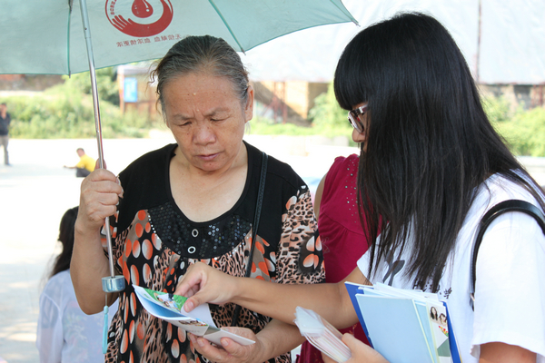 23日的9点钟左右,太阳已经挂在半空之中,路上蒸腾起炎热的气流。可我们支教团成员的热情丝毫没有被天气所影响,按部就班地做着事情。首先,男生负责搭起帐篷,摆放桌椅,挂起长长的横幅,女生则负责将传单分门别类地整理好,摆放在桌子上。紧接着,大家拿起一摞摞的传单就往路上、广场上跑,碰到一个人就给他或她讲解健康知识,发给他或她一张传单。我们支教团准备了《夏季诊室》、《学生预防伤害健康教育手册》、《艾滋病咨询检测指南》、《关注食品安全 享受安康生活》等传单,根据不同行人需求给予最适合最有用的帮助。行人也极其配合我们的志愿者服务,在路旁耐心地倾听我们的健康知识宣传,不时地夸赞我们此次活动非常有意义,并表示希望以后还有类似的志愿者活动。我们也感到非常的高兴,一是我们辛勤的劳动收获了赞许,二是为大家带来了切实有利的帮助。