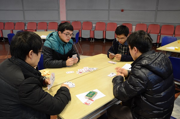 首先开始竞赛的是中国象棋、三人斗地主以及升级2v2三个项目,其中以三人斗地主的赛事最为激烈,参赛人员最多,各选手间水平旗鼓相当。升级2V2比赛过程较之显得平静,但在比赛结束后由于冠亚军比分相当加赛一场,而中国象棋的比赛由于其赛事的特殊性,上午的比赛并未决出冠亚军,最终鲁洋洋、吴海麟、李凯分获三人斗地主的冠、亚、季军,而升级项目的冠亚季军则分别由丁泽伟和颜敏、林文平和朱崇佳、梅运才和倪悦获得。