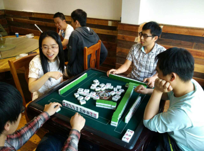 周末,所有同学都来到青芝坞聚餐。来到包厢,同学们发现饭桌旁边有一张麻将桌,纷纷表现出浓厚的兴趣,于是提议大家饭前先玩一会儿麻将。因为有同学还不会但是很感兴趣,所以我们就在教学中开始。大家玩得其乐融融。