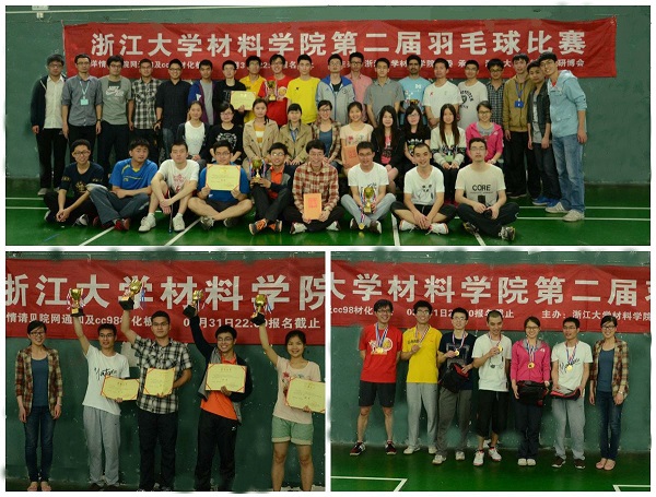 2015年4月18日,浙江大学材料学院第二届羽毛球赛在玉泉校区羽毛球场顺利举行。本次比赛由学院团委主办,学院研博会承办。旨在强健师生体魄,丰富师生的校园生活,增进彼此的交流和沟通,以更好的精神面貌投入到科研生活中去。