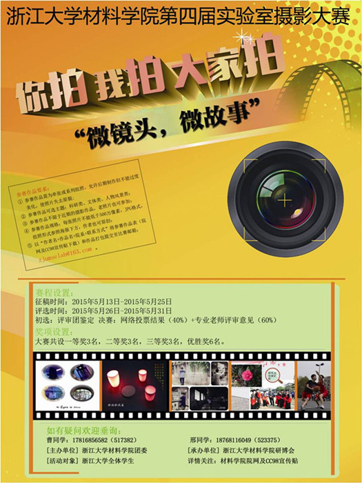 为多角度、全方位的展示浙江大学校园生活,给爱好、擅长摄影的同学提供学习、交流、展示的平台,浙江大学材料学院举办主题为“微镜头,微故事”的摄影大赛,现向全校学生征集科研、文体、人物风景等为主题的摄影作品。