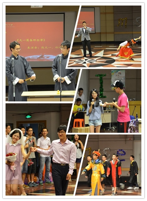 再接下来的节目更是异彩纷呈,郑斌和熊天一同学带来的相声《天一哥哥那些事》引得全场爆笑不止;史振宇和付博同学以一曲《等待》、《鸿雁》征服了全场;材料1104班带来的小品《蛤蛤速递》、材料1103班的音乐剧《你是我心内的一首歌》、材料1101班的舞台剧《皇帝选妃Ⅱ》更是一个个都博得满堂彩,把整个晚会推向了高潮!