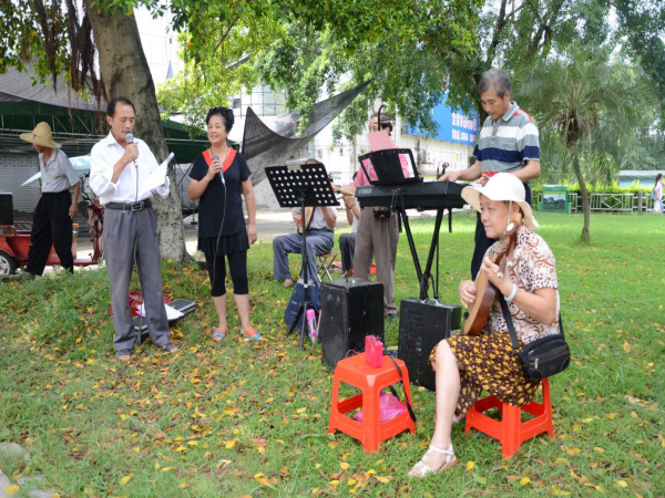 歌唱团的主唱是前广播站退休的阿姨,我听其他的成员说这位阿姨在年轻时是宜州有名的歌唱家,她在为我们表演的过程中姿态优美,举手投足间流露出一种艺术家的气质。她为我们介绍了宜州市非物质文化遗产的特色,如刘三姐、山歌、彩调等。