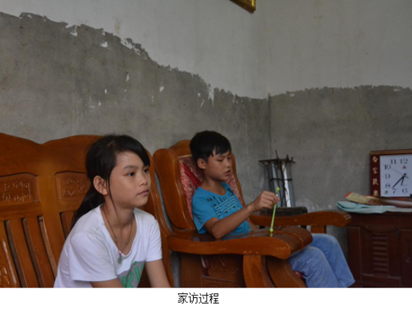7月17日至7月19日,社会实践团队中的关爱留守儿童小组分别对合寨小学的蒙永进、许雪晶和许雪莹姐妹、谭艺4位同学进行了家访。在家访中,小组成员们对学生的基本生活状况、家庭环境、未来规划、在生活及学习中存在的问题等进行了详细的了解。家访的结果显示,目前对于留守儿童来说,最大的困难并非经济条件,而是家庭教育的缺乏与学校教育的落后,由于教学资源的匮乏,导致这些孩子不能从小接受良好的教育,因此即便有机会去父母打工的城市读书,也难以跟上班里进度,产生自卑心理。另外,高昂的借读费也是这些留守儿童跟随父母去外地读书的拦路石之一。但是,这些困难仍然阻挡不了孩子们对于知识的渴求,许多孩子从小就非常独立懂事。