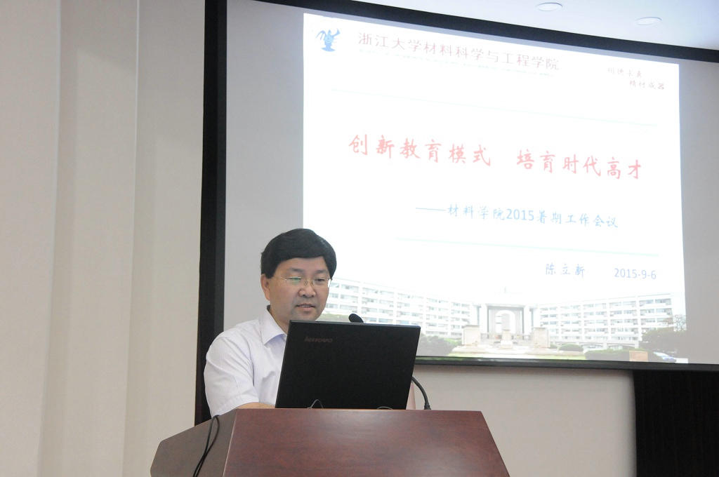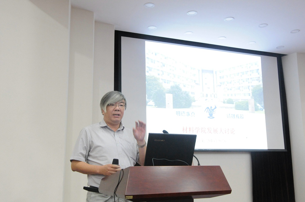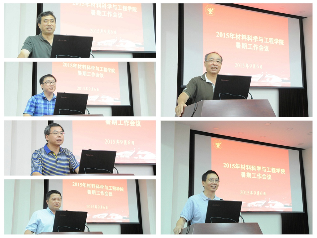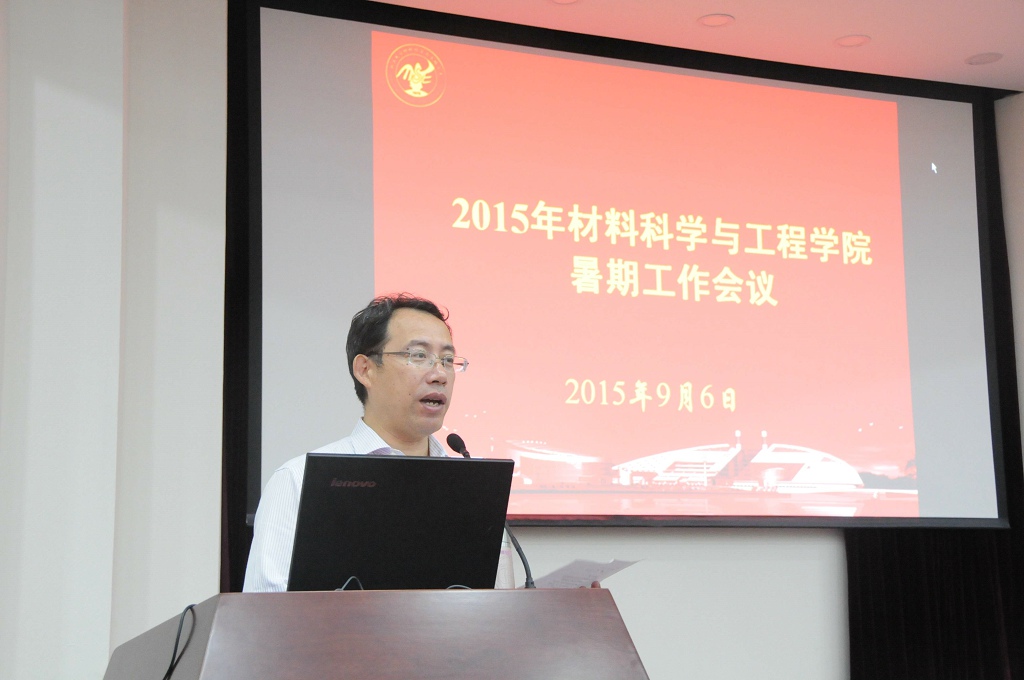 陈立新副院长作了“创新教育模式,培育时代高才”的专题报告。报告分析了目前材料专业的发展现状及学院开展教育教学大讨论情况,并对学院近期教学工作要点、学位点授予点合格评估及新一轮学科评估工作进行了详细的部署。然后,吴勇军副院长作了实验室工作和学院科研工作报告。报告详细介绍了学院实验室研究项目申报情况、暑期实验室安全教育情况和近期实验室监控系统安装等情况,同时通报了2015年国家自然科学基金资助情况和“111”引智计划申报等情况。