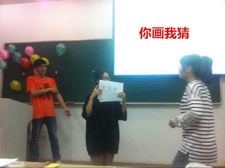 第二个游戏是你画我猜。这个游戏比较普遍,我们设计方主要从具体的词汇上动脑,尽量用切合我们学生生活的词汇,比如:韩高荣、捡肥皂等。游戏效果很好,玩者兴奋、看者乐。限定时间内回答通过最多的还获得了独一无二的情侣杯一套。